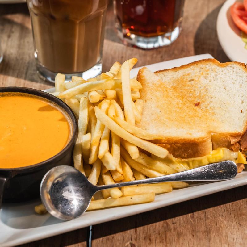 Texas toast filled with Cheddar, America and jack Cheese served with our creamy tomato soup, fries or a house salad